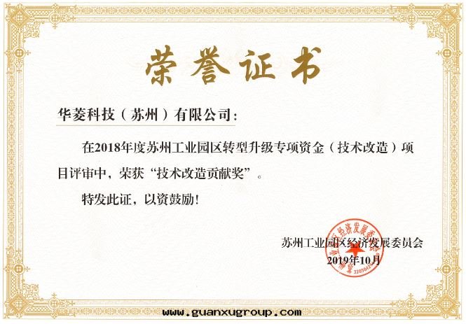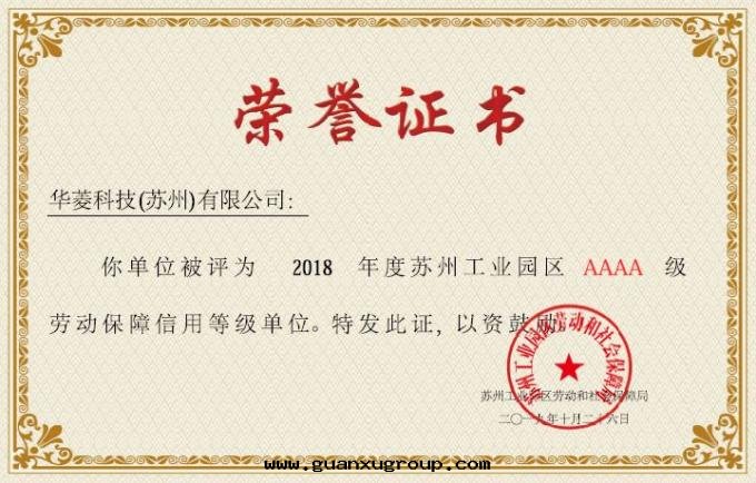 我(wǒ)公(gōng)司被(bèi)評为(wèi)2017-2018年(nián)度(dù)“蘇州工業園(yuán)區(qū)勞動(dòng)關(guān)系(xì)和諧企業”,並(bìng)獲得了(le)2018年(nián)度(dù)“蘇州工業園(yuán)區(qū)勞動(dòng)保障信(xìn)用(yòng)等级4A证書(shū)”和“技術(shù)改造貢献獎”。